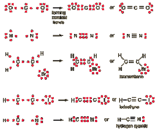 A diferencia de lo que pasa en un enlace iónico, en donde se produce la transferencia de electrones de un átomo a otro; en el enlace covalente, los electrones de enlace son compartidos por ambos átomos. En el enlace covalente, los dos átomos no metálicos comparten uno o más electrones, es decir se unen a través de sus electrones en el último orbital, el cual depende del número atómico en cuestión. Entre los dos átomos pueden compartirse uno, dos o tres pares de electrones, lo cual dará lugar a la formación de un enlace simple, doble o triple respectivamente. En la estructura de Lewis, estos enlaces pueden representarse por una pequeña línea entre los átomos.